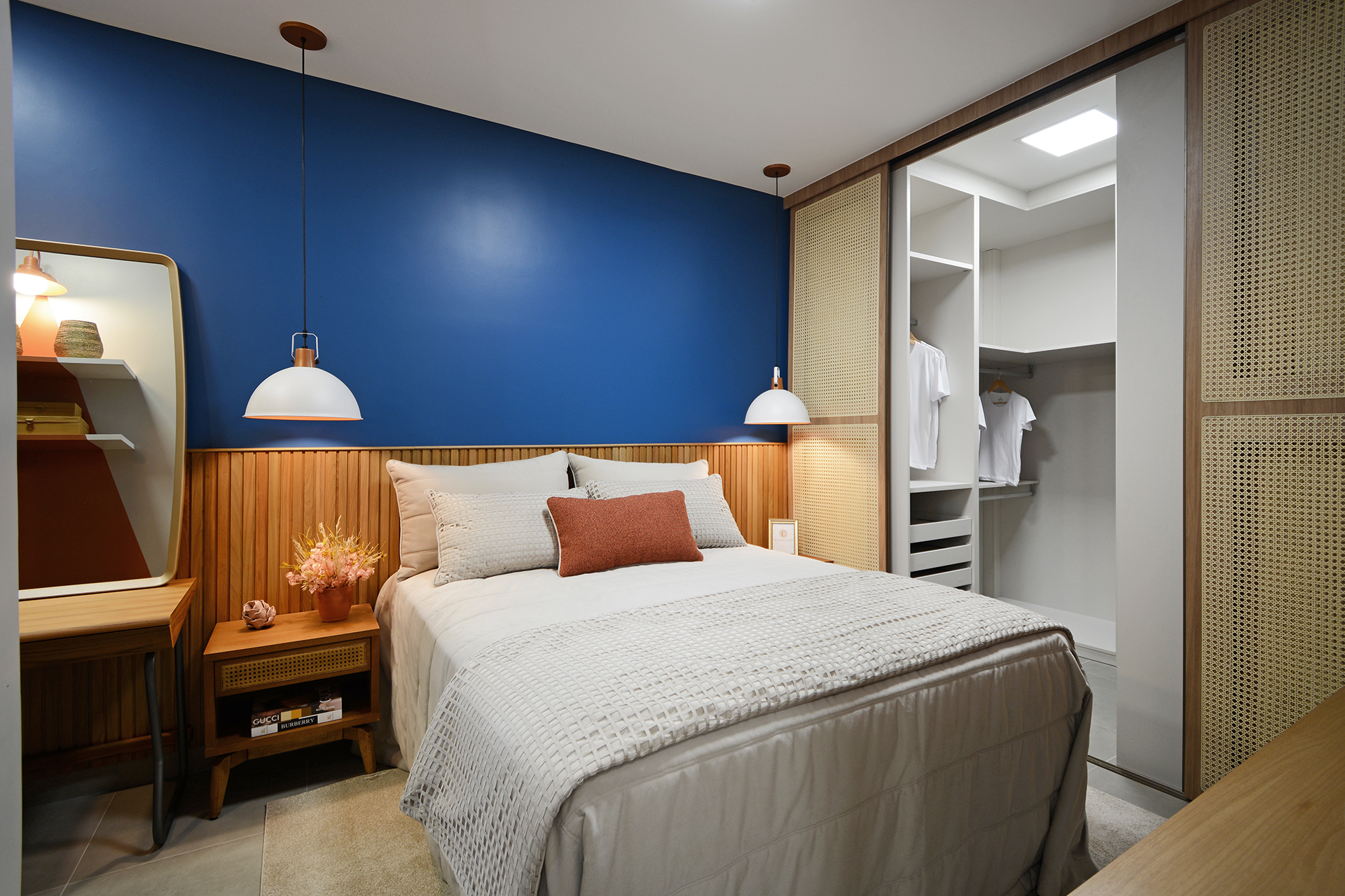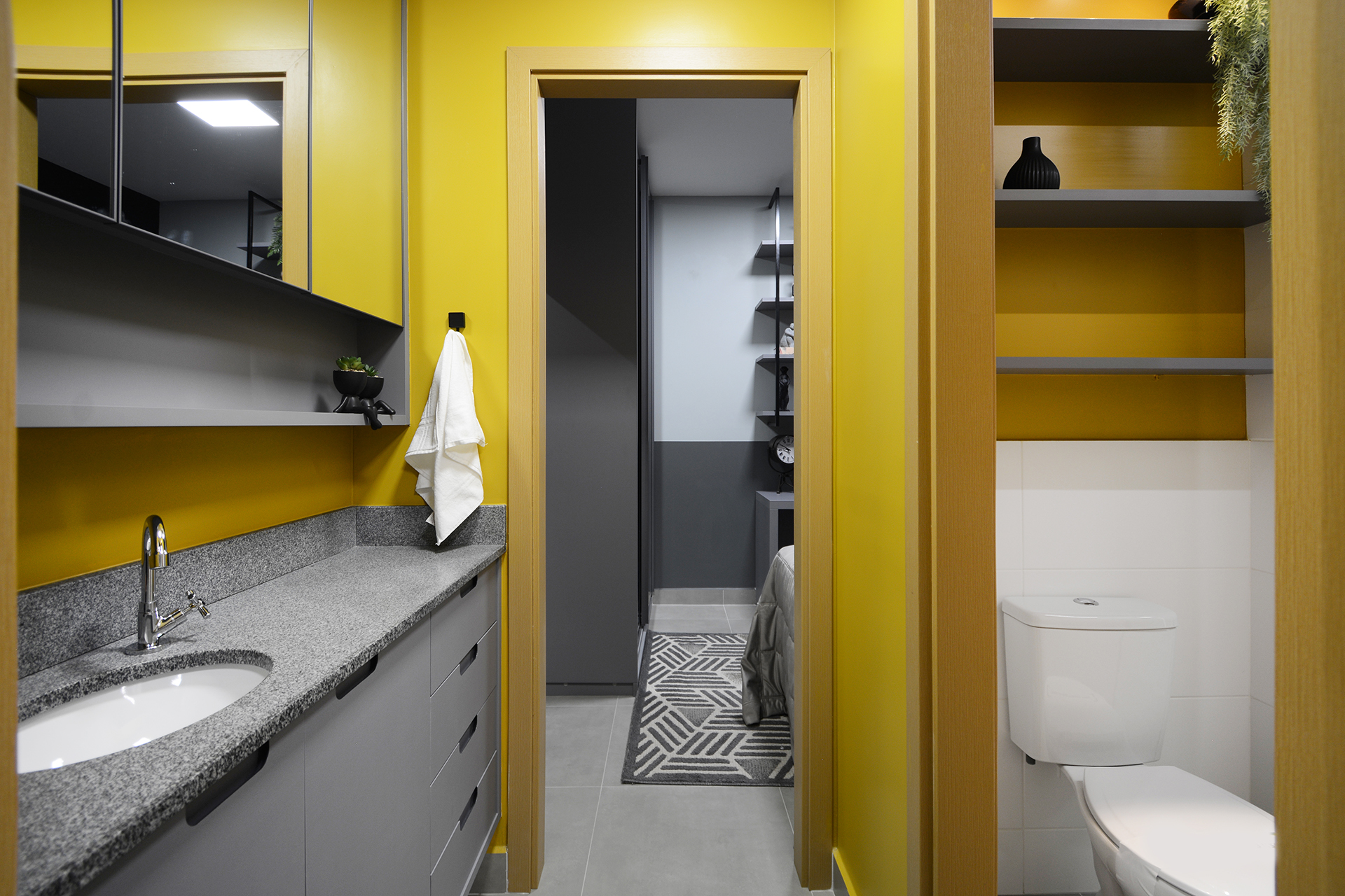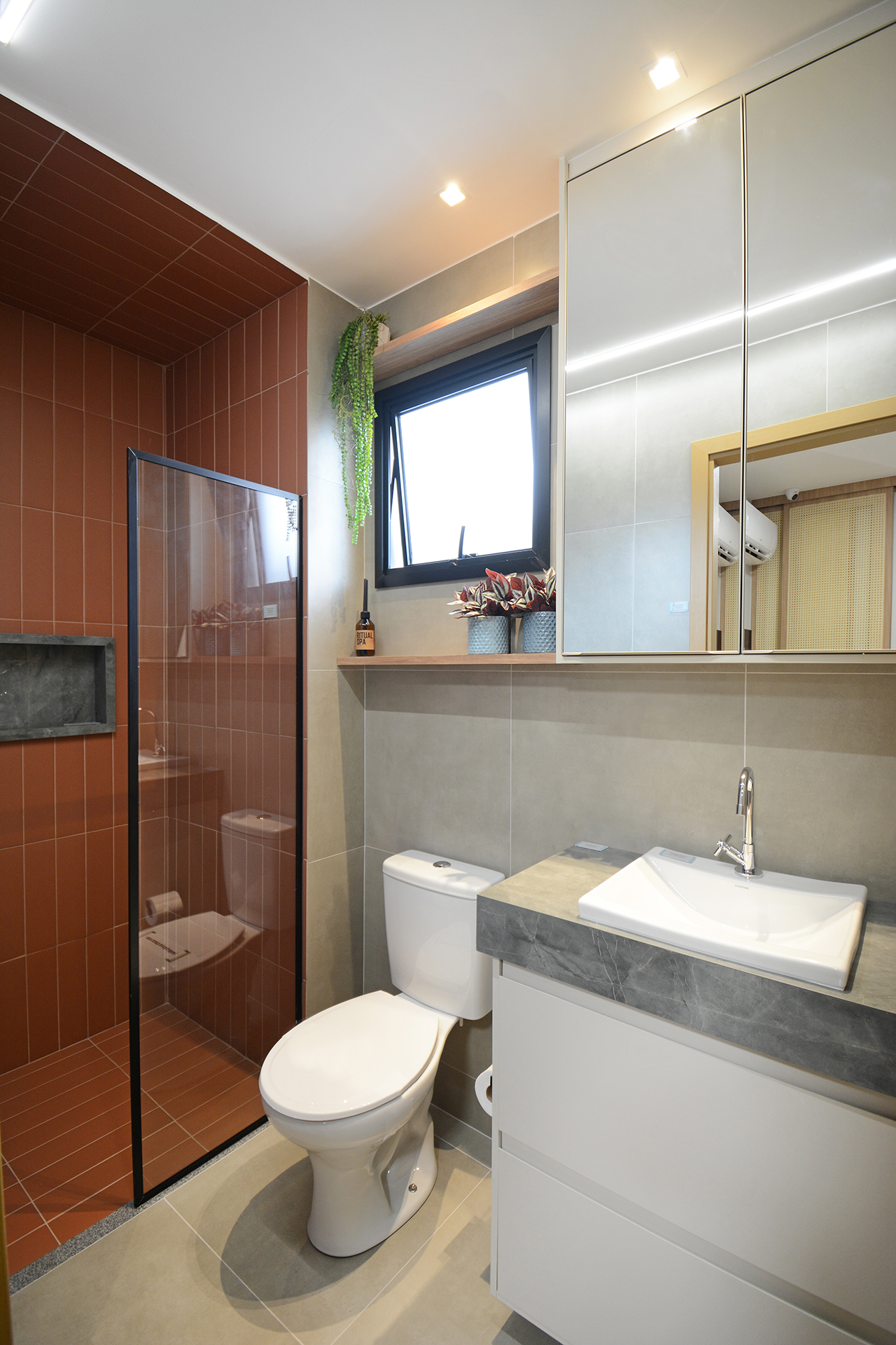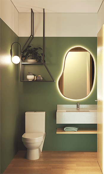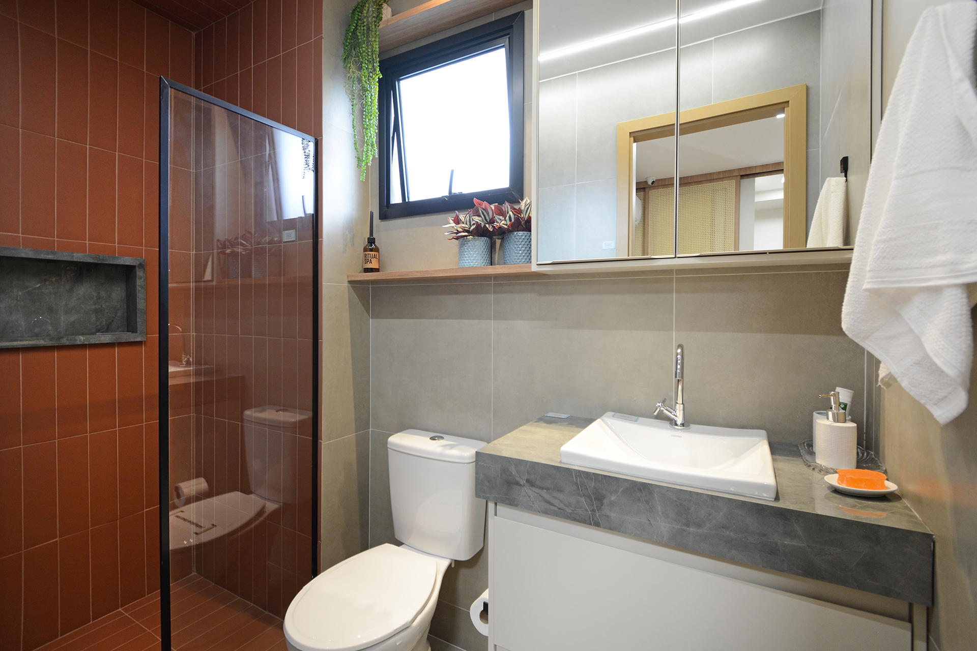 Banhos 100% revestidos, bancada em granito, bacia sanitária com caixa acoplada e sistema de duplo acionamento.