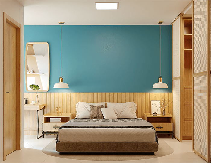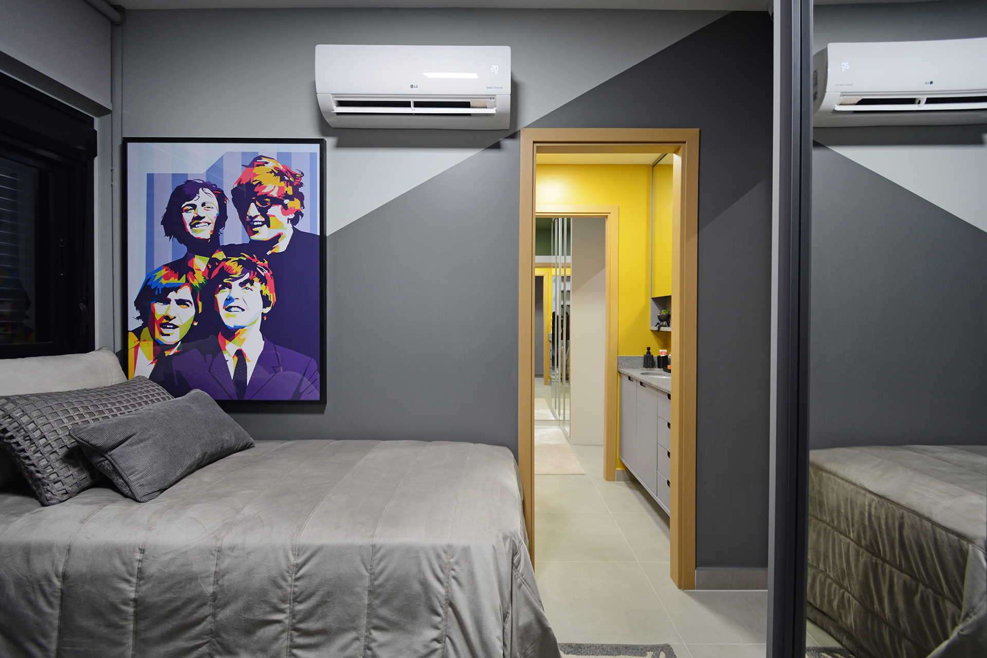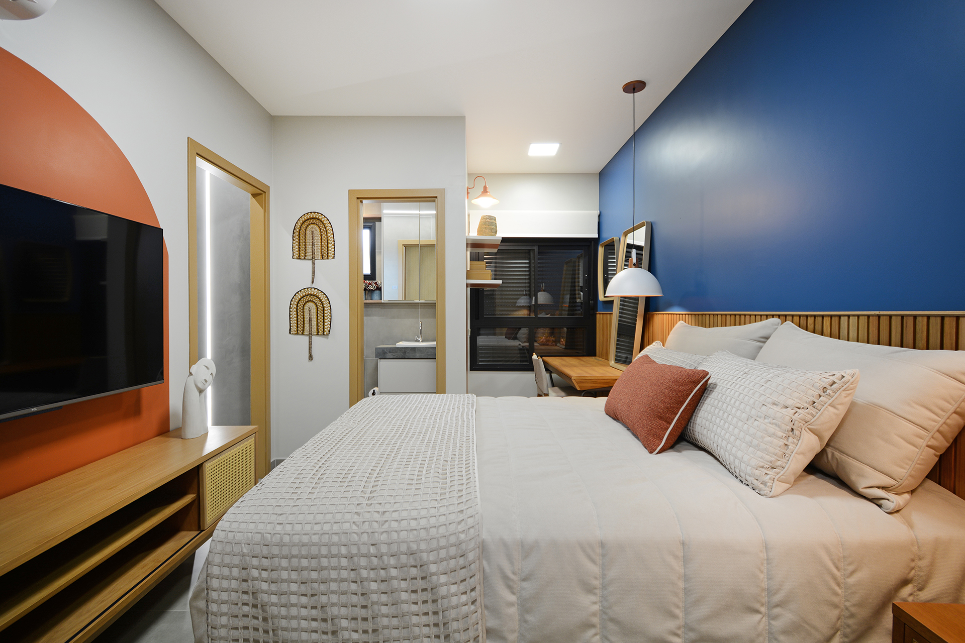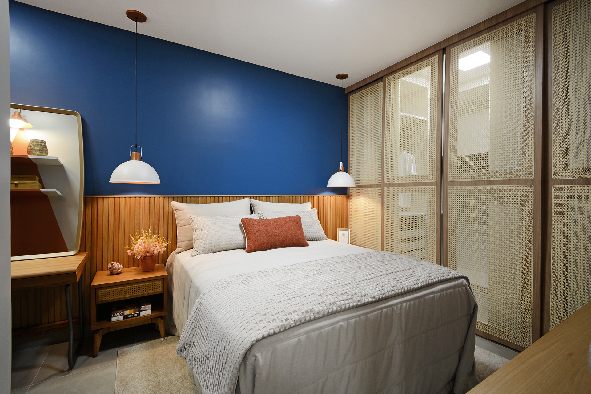 Banhos 100% revestidos, bancada em granito, bacia sanitária com caixa acoplada e sistema de duplo acionamento.