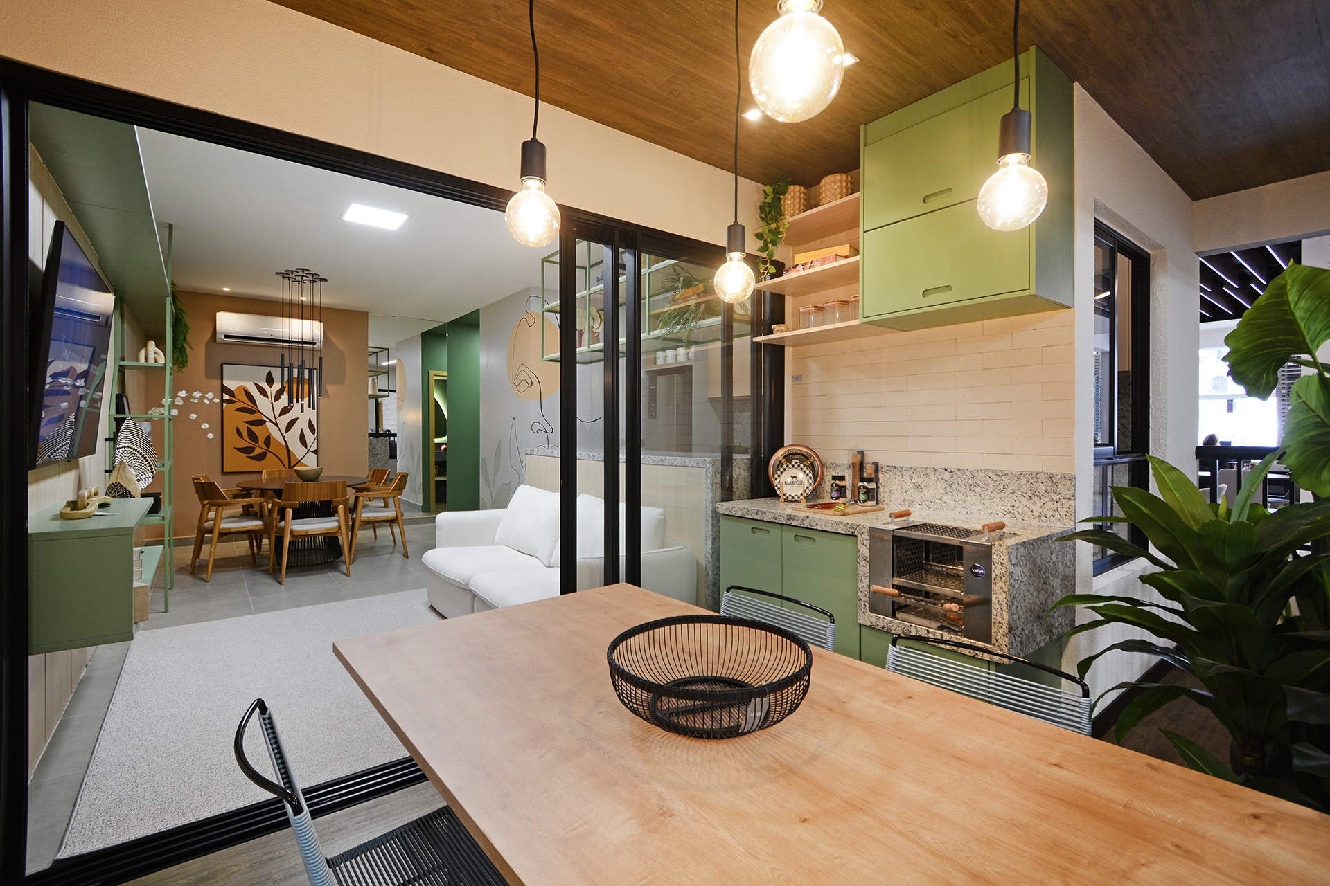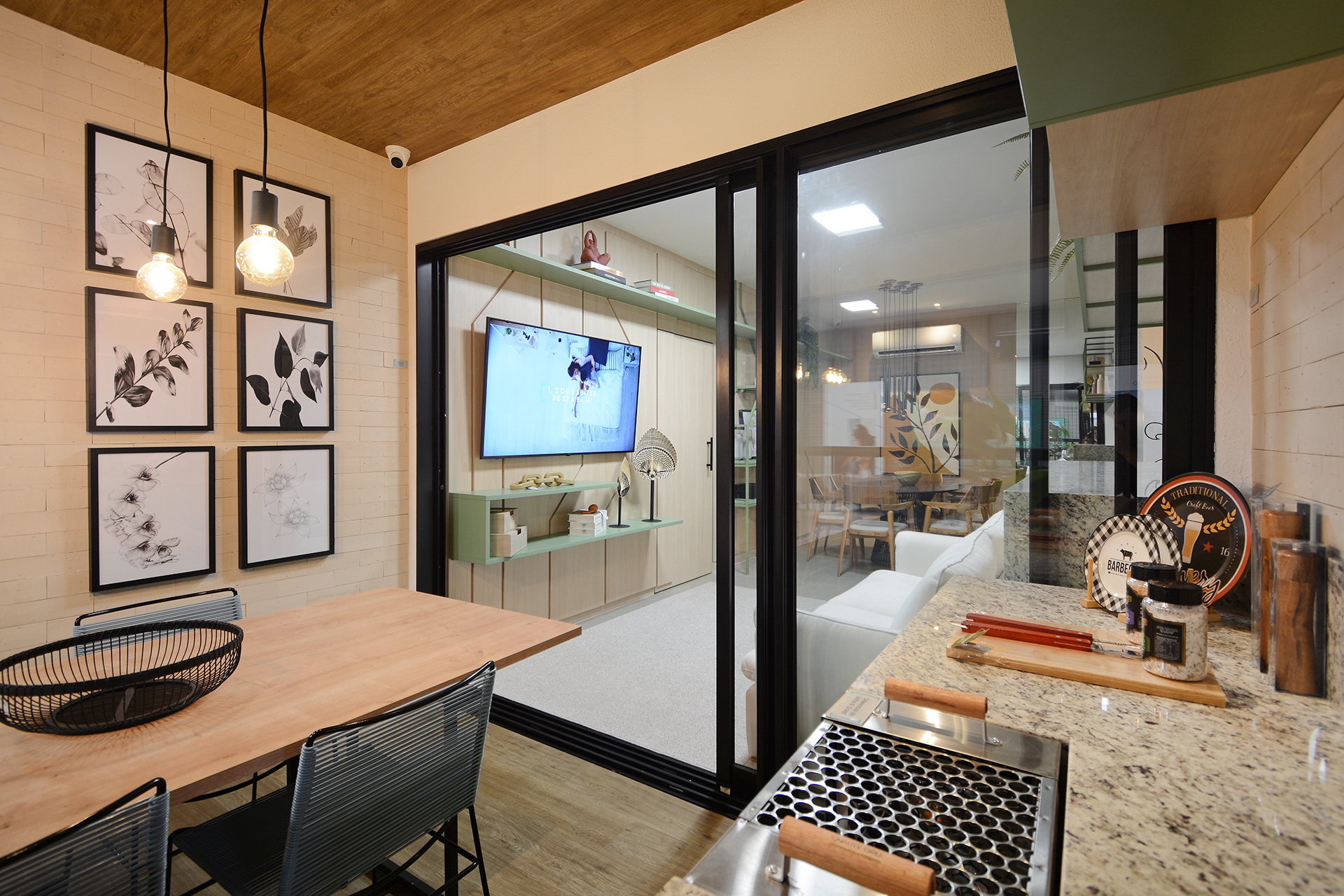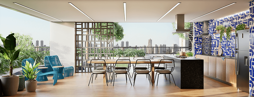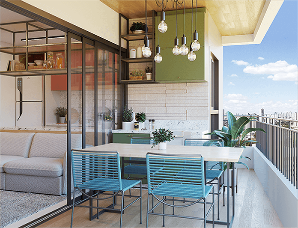 Varandas com bancada em granito e churrasqueira ecológica à carvão 3 espetos.