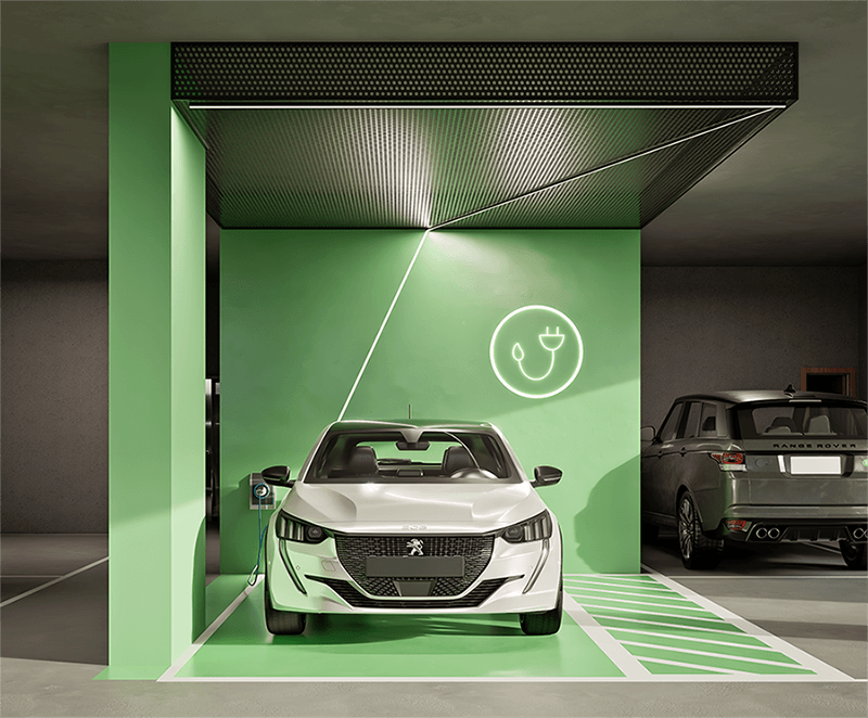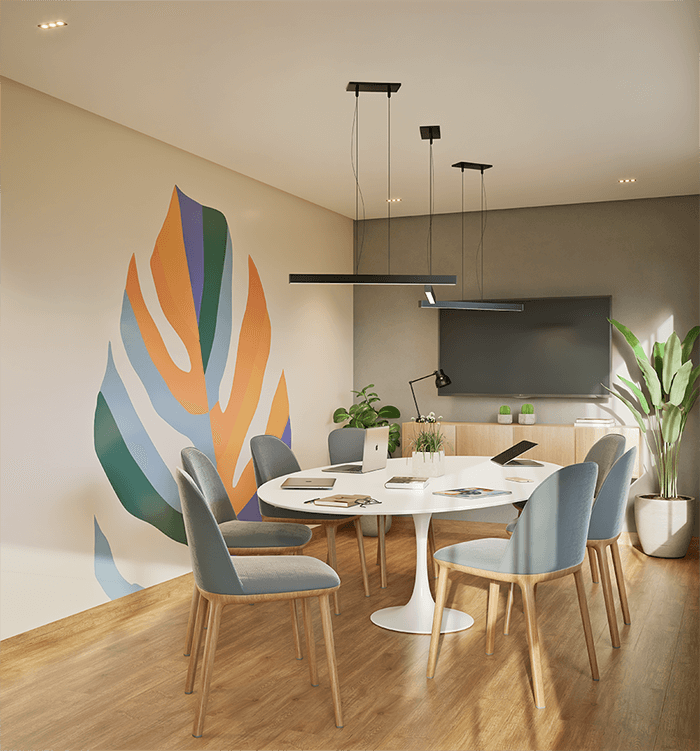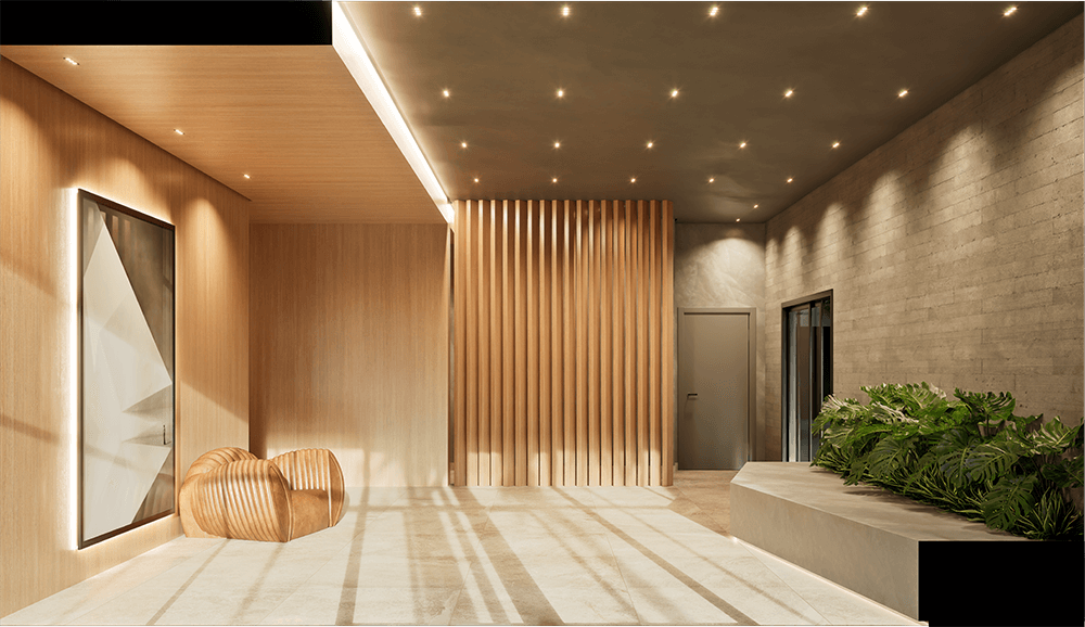 Fachada – jardim natural vertical com irrigação automatizada; Textura acrílica.